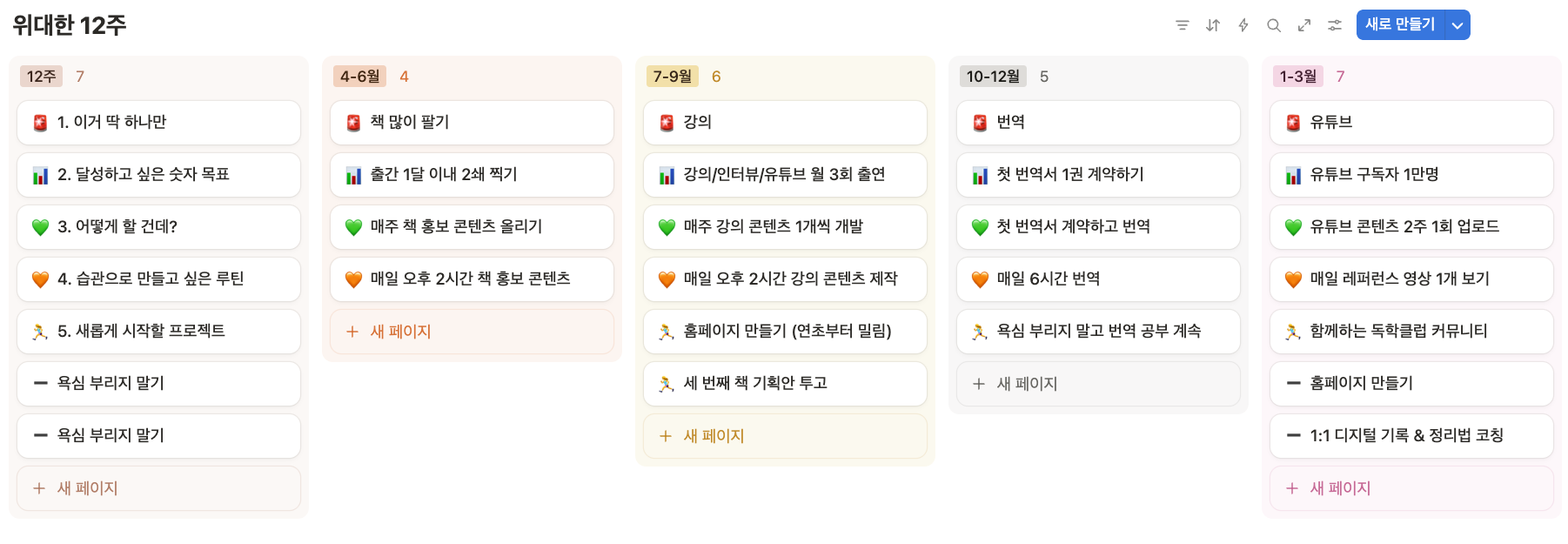 ** 12주 단위로 목표를 세우는 컨셉은 책 [위대한 12주]에서 아이디어를 얻었어요.