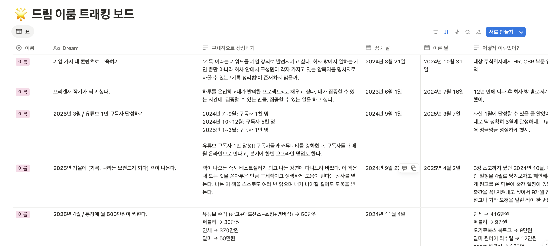 : 내가 꾼 꿈들을 이뤄가고 있는지 현황을 점검하는 노션 페이지에요. 꿈을 이룬 기쁜 날, 드림 이룸 트래킹 보드를 열어 [꿈꾸는 중] 상태 표시값을 [이룸]으로 바꿔요. |
