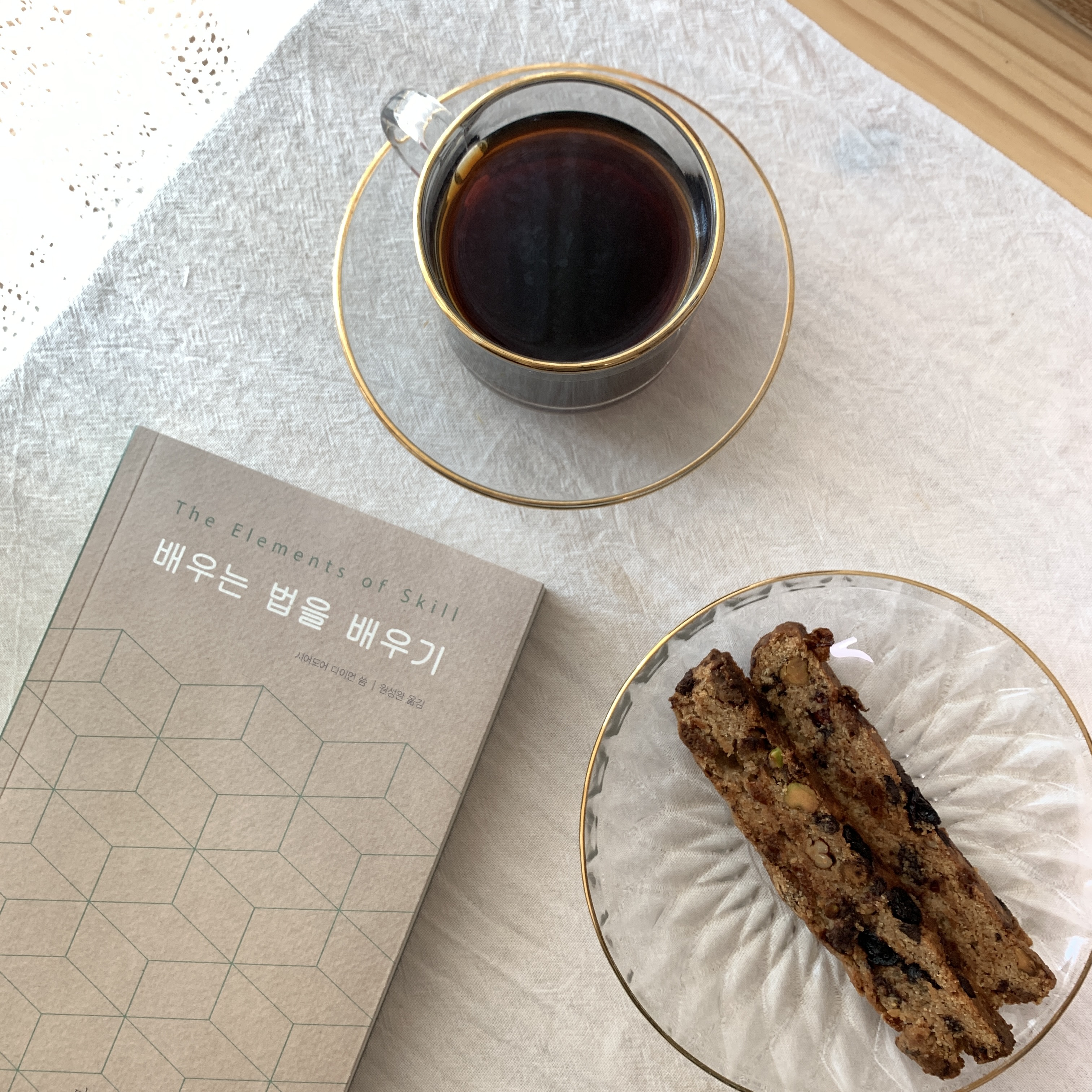 🍵 델픽 <샹그릴라> 허브차 제품 이름을 슬쩍 보고 빨간 색의 찻물이 우러날 거라고 생각했어요. 샹그리아 와인과 비슷한 단어여서 그랬나봐요. Shangri-la는 제임스 힐턴의 소설 <잃어버린 지평선>에 등장하는 영원히 늙지 않고 젊음을 누릴 수 있는 가상의 지상낙원이라고 합니다. 그 설명을 보니 이번에는 달콤한 꽃이나 과일 블렌딩티일까? 생각했는데 찻잎을 우려보니 이국적인 향신료가 주재료였어요. 여러 번 예상을 뒤엎은 샹그릴라는 레몬그라스, 레몬버베나, 바질, 펜넬, 오렌지블라썸이 어우러져 시원하게 톡 쏘면서도 편안한 느낌이더라고요. 카페인이 없어서 저녁 차로 추천합니다. 📖 배우는 법을 배우기, 시어도어 다이먼 잘 하기 위해 애쓰는 것이 새로운 것을 배우는 데 가장 큰 장애물이라는 대목에서 띵- 하고 머리가 울렸어요. 문장 몇 개를 옮겨볼게요. 배움의 과정은 무엇을 '해야 하는가'만이 아니라 무엇을 '하지 않아야 하는가'라는 질문도 포함하고 있는 것이다. 배움에서 일어나는 대부분의 문제는 우리가 자신의 행위 패턴 긴장, 나쁜 습관들은 바꾸지 않고 애만 쓰다 보니 꽉 막힌 상태에 처한다는 것이다. 즉, 더 잘하려 애쓰는 것이 오히려 배움에는 방해가 된다. 해야 하는 일을 다른 방식으로 이해할 수 있을 때 우리는 자신의 학습 과정을 장악할 수 있게 된다. 아이들이 배움을 쉽고 즐겁게 받아들이는 이유 중 하나는 그들이 미래에 대한 걱정을 하지 않기 때문이다. 아이들은 지금 이 순간에 순수하고 기쁜 마음으로 온전히 몰입하며, 그래서 효율적으로 배운다. 이와 반대로 어른들은 자신이 무언가를 이해하지 못할까 염려한다. 우리는 과업이나 목표에 사로잡혀 자유롭게 실험하는 것을 두려워한다. 애쓰지 않고 자연스럽게 과정을 즐기며 성취하는 것이 진정한 배움이라고 해요. 머리로는 알겠는데 현실에서는 어떻게 적용해야 할까요...? 알게 된다면 여러분께 꼭! 경험을 나눌게요.