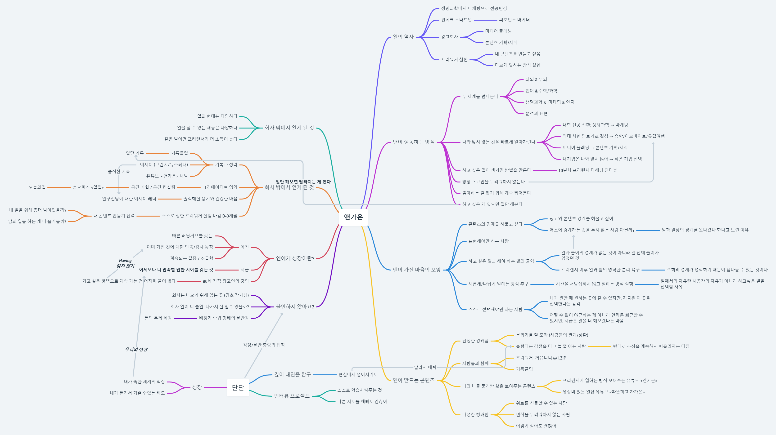 💌 고민이 도착했습니다 뉴스레터를 시작해보려고 해요. 콘텐츠로 인터뷰를 하려고 하는데 막상 시작하려니 막막하더라고요. 인터뷰 질문 준비, 인터뷰이 컨텍과정, 인터뷰진행 과정, 대략의 시간, 인터뷰 진행 후 컨텐츠로 정리하는 팁이 궁금해요! ![]() ![]() 인터뷰이 어떻게 컨택하나요? 첫 상대로 긍정의 기운을 주는 사람을 인터뷰해보세요. 흔쾌히 제안을 승낙할 것 같은 인터뷰이 중에서 좋은 이야기를 나눠줄 것 같은 사람이 누구일까 떠올려보세요. 저의 첫 뉴스레터 인터뷰이 혜진님은 언제나 긍정적인 기운을 주는 사람인 동시에 일을 바라보는 관점이 재미있고 궁금한 분이었어요. 친구나 지인 범주부터 생각해보는 것을 추천해요. 아는 사람이어서 더 떨릴 수 있지만 기본적으로 서로 호감이 있어야 따뜻한 응원도 가득 받을 수 있으니까요. 인터뷰 질문 준비 총 세 단계를 거쳐요. [SNS 탐구하기] - [키워드 정리하기] - [구체적인 질문 잡기] 인터뷰이로 초대할 만큼 좋은 이야기를 가진 분이라면 SNS에 생각을 활발하게 공유하는 사람일 가능성이 높아요. 인스타그램, 블로그, 브런치, 유튜브 등등 미리 그 사람이 <겉으로 드러내보이는> 정보를 공부해요. 키워드는 whimsical 서비스로 마인드맵을 그리며 정리해요. 아래는 앤가은님의 인터뷰를 준비할 때 작성한 마인드맵 사진이에요. 이 마인드맵을 보면서 구체적인 질문 리스트를 작성합니다.