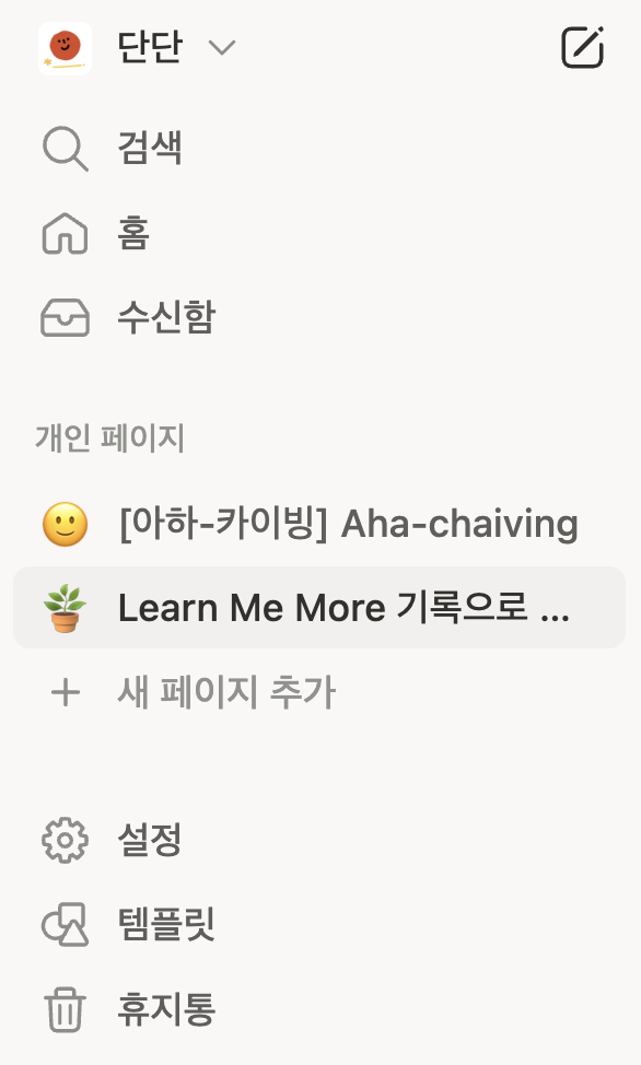 제 노션을 열어보면 메뉴바에 개인 페이지는 딱, 2개뿐입니다.