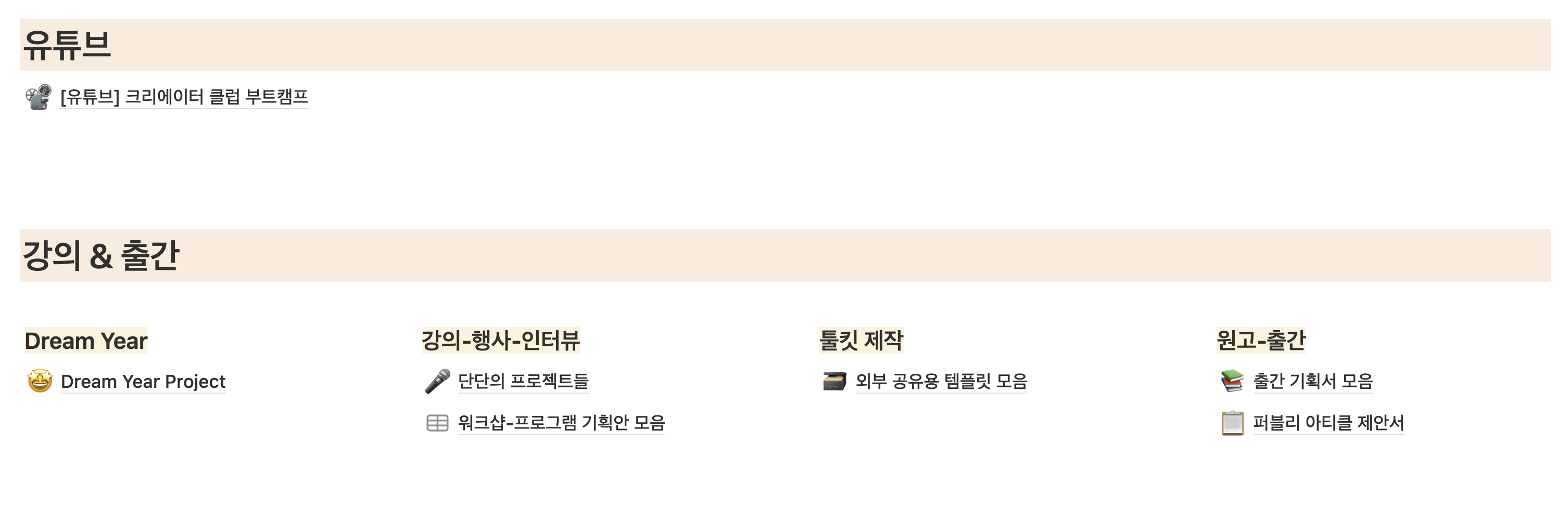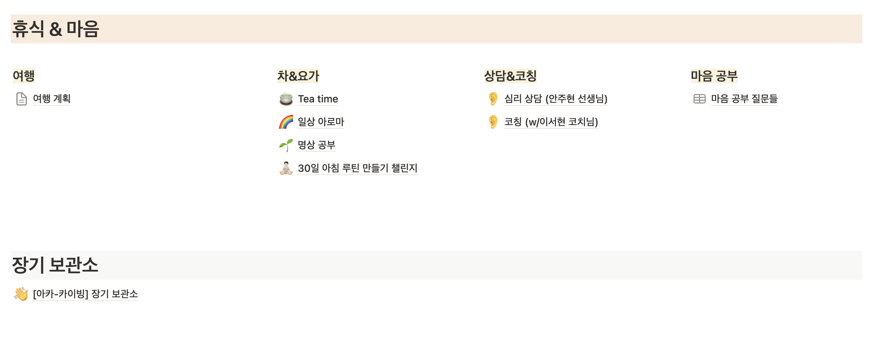 저는 이렇게 두 개 페이지로 나누어 모든 노션 페이지를 정리합니다. 이제 하나씩 천천히 살펴볼까요? |