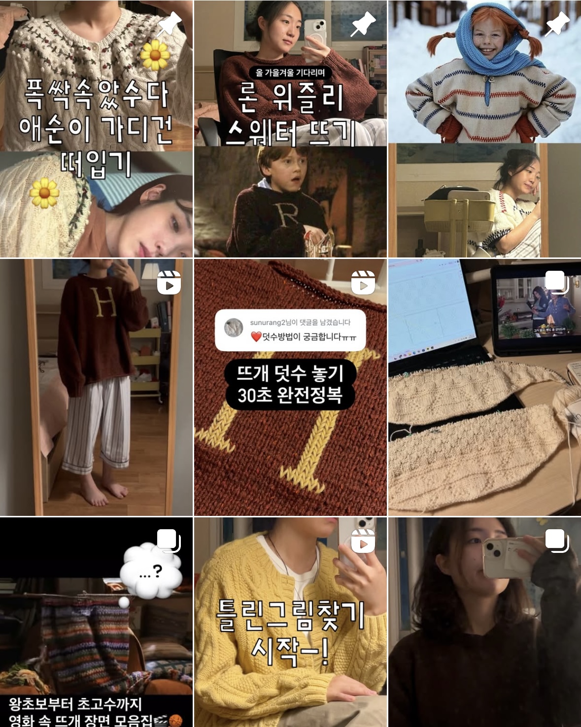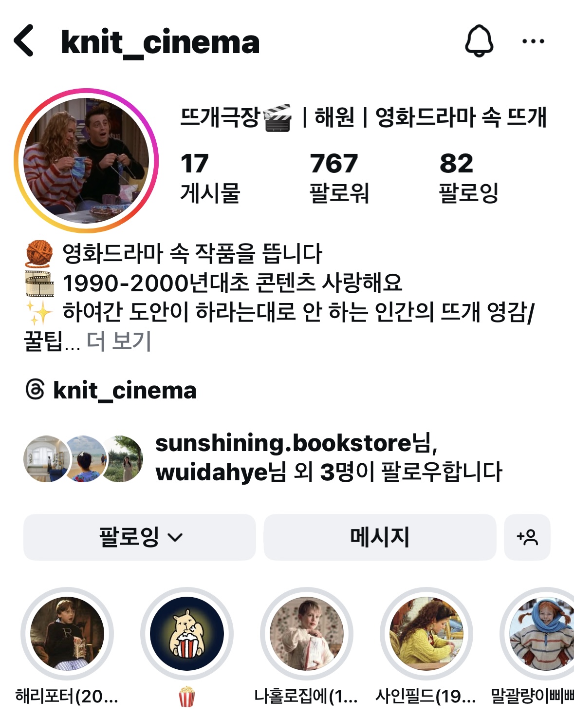 영화와 뜨개라는 두 가지 키워드를 엮은 거죠. 아마 이분은 영화도 좋아하고 뜨개도 좋아할 것 같은데, 두 가지를 함께 엮어서 '영화드라마 속 작품을 뜹니다'라고 하니까 재미있는 컨셉이 탄생한 거죠. 저는 심지어 평생 뜨개와 인연이 없는 사람인데도 바로 팔로우했어요.