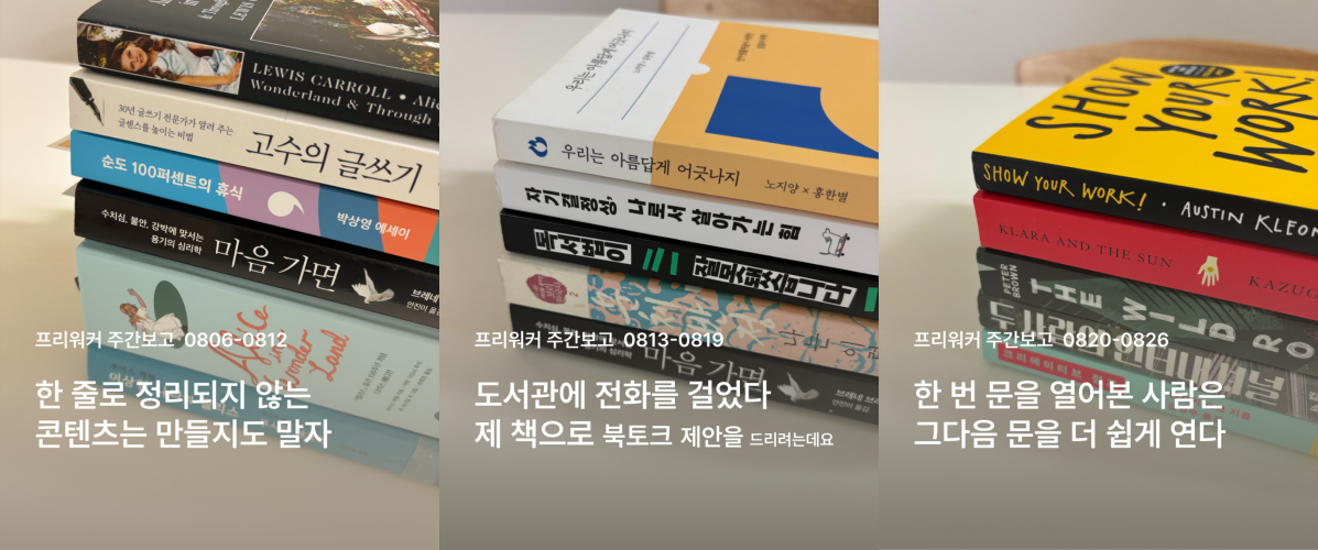 제가 매주 수요일에 올리는 [프리워커 주간보고]는 콘텐츠 하나의 제목이 아니라 시리즈물의 제목입니다. 시리즈 제목 역시 한번 잘 잡아두면 일관된 맥락을 유지할 수 있어요. <프리워커 주간 보고>는 프리워커, 주간, 보고 라는 세 가지 키워드를 조합해서 만들었어요.