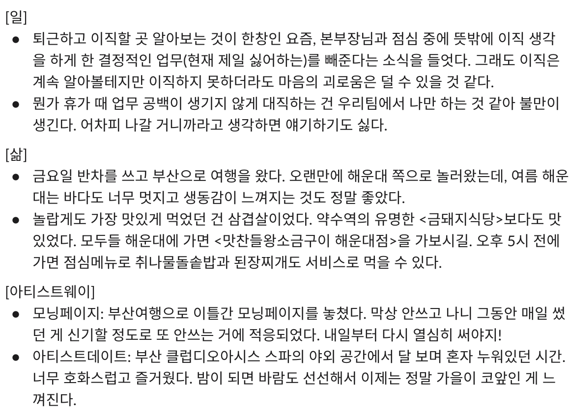 한동안 정신없이 번역 작업하고 콘텐츠 만드느라 책 읽을 시간이 없었다. 인풋 대비 아웃풋이 너무 많아진 것. 9월은 인풋을 다시 늘려야겠다. 도서관에서 빌려온 <크리에이티브 점프> 연체하지 말고 읽자. 선샤이닝 독서모임도 재미있게 다녀오고 모임책인 <먼저 온 미래> 이번주까지 완독하자.