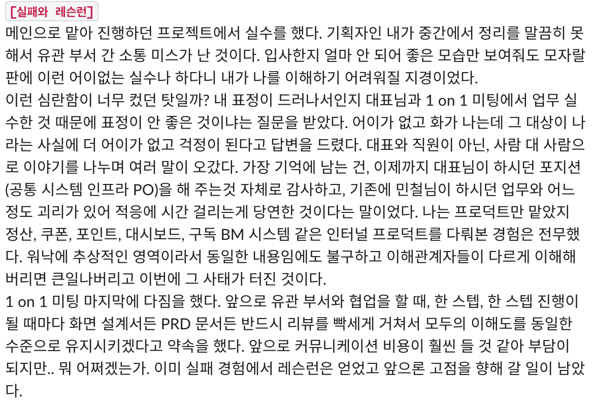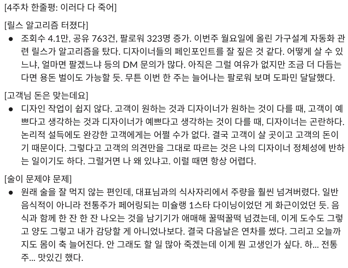 신기하게도 바로 그 못난 성격 덕분에 나는 항상 마감을 지킨다. 프리워커 주간보고도, 뉴스레터도, 한달 회고도 시작한 이후로 단 한번도 펑크낸 적이 없다. 이런 시간이 쌓이면서 스스로를 믿을 수 있게 되었다. 탁월하게 잘할 자신은 없어도 기어이 해낼 자신은 있다.