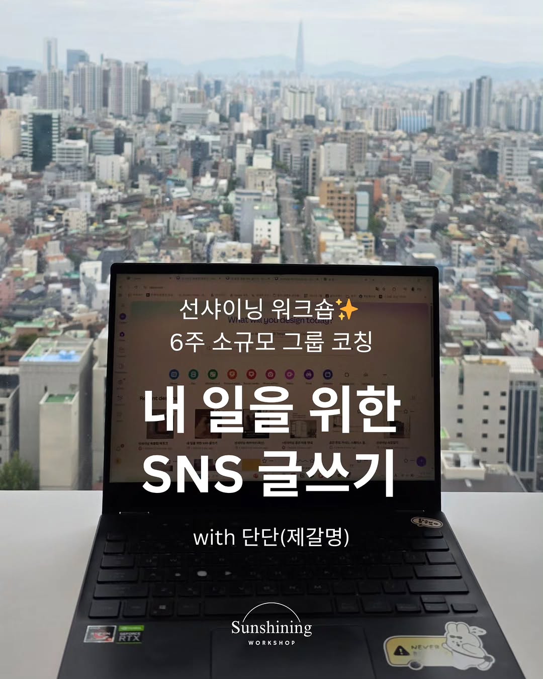 강남역 근처 28층 서점 선샤이닝과 함께 <내 일을 위한 SNS 글쓰기> 워크숍을 기획했습니다. 집콕생활자 정체성도 이제 탈피해 보려고요. 오프라인으로 만나는 기회를 점점 늘려보려고 합니다.