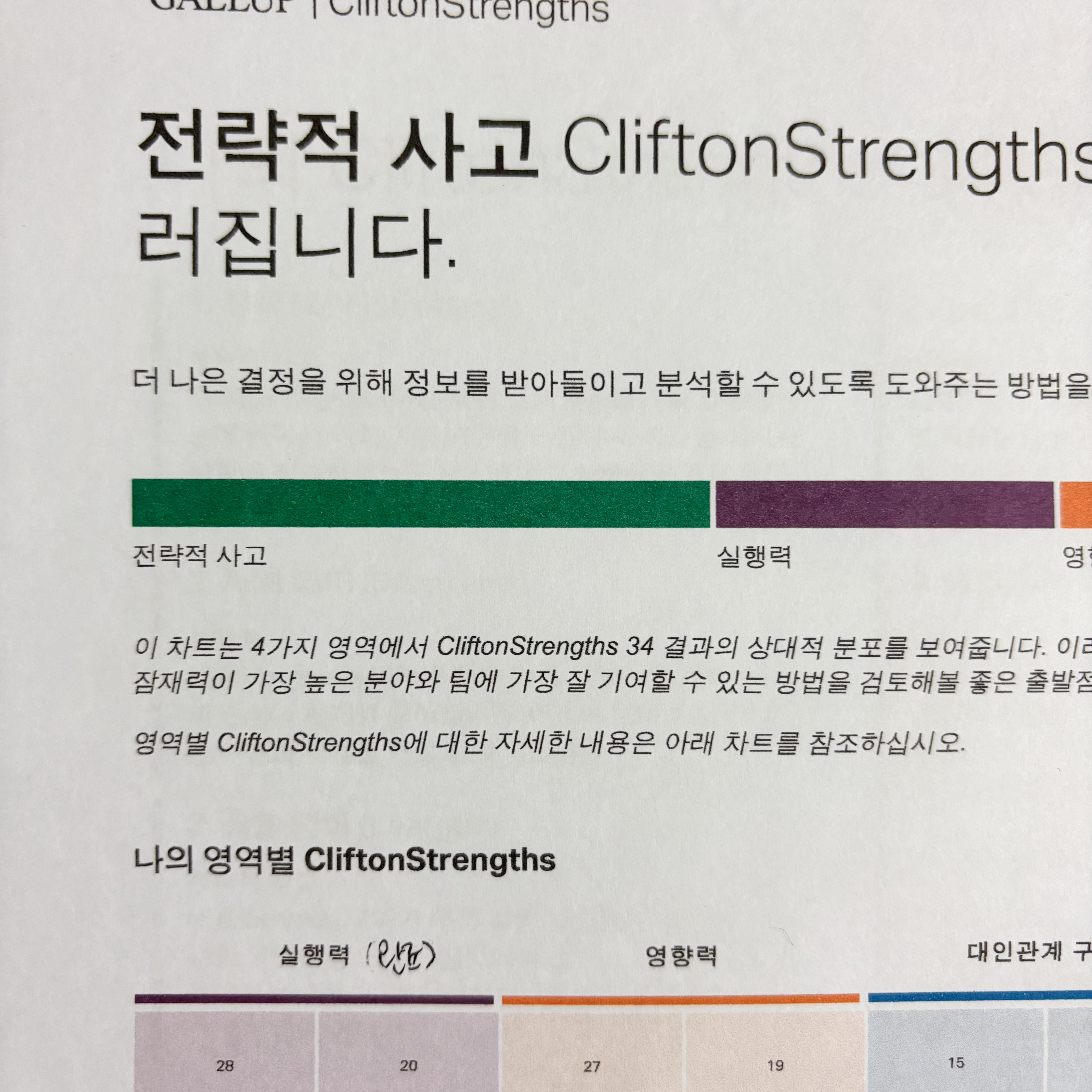 *민감한 내용이 많아서 개인 기록에서 일부만 발췌했어요. 생생하게 전하기 위해 노트에 기록한 문체 그대로 옮깁니다. 제가 진행한 강점 검사는 갤럽 강점 검사이고 김인숙 강점 코치님께 코칭받았어요. (갤럽 강점 검사란? 34개 개인 강점을 해석하는 진단 도구) |
